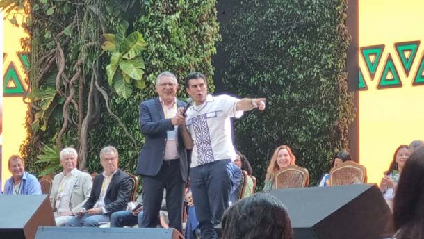 Foto de Helder Barbalho com camisa marajoara no evento “Diálogos Amazônicos”, em 4 de agosto de 2023.