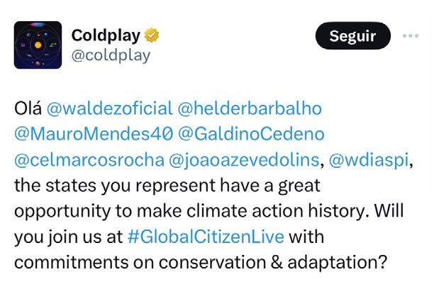 Em setembro de 2021, o grupo de rock Coldplay integrou a programação do evento Global Citizen Live. Pelo X, então Twitte r , a banda chamou vários governadores brasileiros – entre eles, Helder Barbalho – para participarem do evento e discutirem as mudanças climáticas. O governador paraense respondeu prontamente, participou da atividade e apresentou, na ocasião, o site do “Plano Amazônia Agora”, focado no desenvolvimento local e na preservação ambiental. Foi mais uma ação no sentido de associar a sua marca política ao cenário das discussões globais a partir da marca Amazônia.