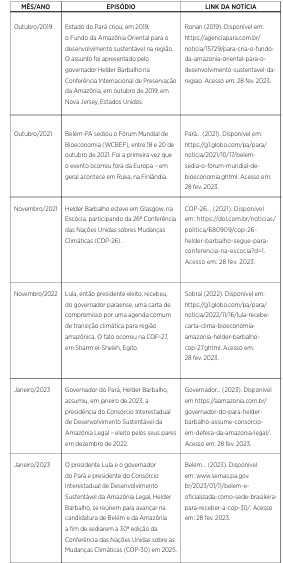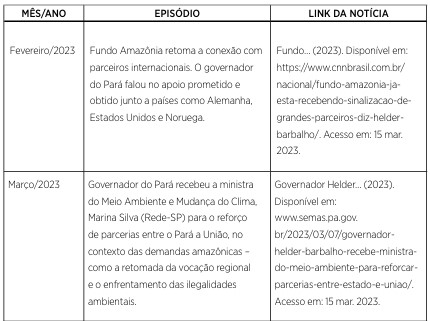 Nesta seção, serão citados alguns exemplos, em ordem cronológica, a partir de um quadro-resumo ( Quadro 1 ), de fatos e eventos em que Helder Barbalho conquistou espaço nas arenas nacionais e internacionais, tendo a junto a si a temática da região amazônica e a marca Amazônia ( Amaral Filho, 2016 ). É importante ressaltar que o recorte temporal se dá entre 2019 e 2023.