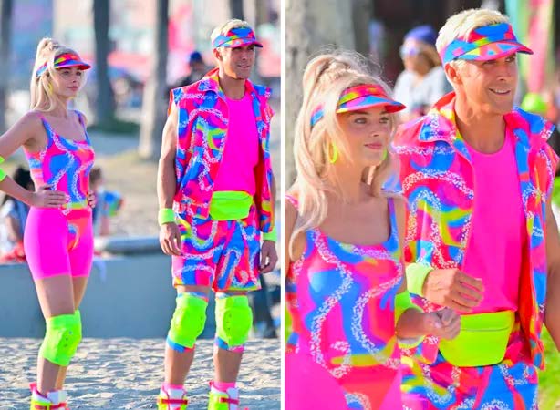 Dessa forma, a cada vez que algo novo sobre o filme era divulgado, o público se entusiasmava mais e a procura por temas associados à boneca crescia. A primeira vez que algo significativo aconteceu foi na CinemaCon, evento internacional dedicado ao mercado cinematográfico, realizado em Las Vegas, em 2022, ocasião em que uma foto em um display da Barbie dirigindo seu carro na Barbilândia gerou grande expectativa no público (RUBIN, 2023 ). Um mês depois, Margot e Ryan, atores protagonistas, foram fotografados com o figurino néon do filme em uma praia em Los Angeles durante as gravações do filme ( Figura 1 ), o que fez com que o público se interessasse ainda mais pelas especulações a respeito da materialização em tamanhos humanos de elementos estéticos reconhecidos como parte do universo da boneca, isto é, roupas, sapatos, acessórios etc.