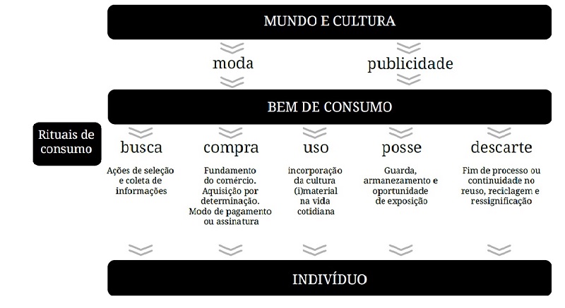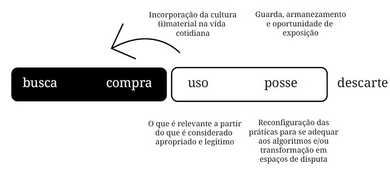 Em síntese, o ritual de busca diz respeito às ações de seleção e coleta de informações sobre o bem de interesse, enquanto o ritual de compra é a aquisição por determinado modo de pagamento ou assinatura. Em sequência, o ritual de uso é a incorporação da cultura (i)material na vida cotidiana, fundindo o coletivo ao individual, ao passo que o ritual de posse reúne os esforços de reafirmação de propriedade (como a conservação, o armazenamento e as oportunidades de exposição). Por fim, o ritual de descarte pode ser o fim do processo, quando o bem já não oferece significados do interesse do indivíduo, ou a continuidade no reuso, na reciclagem e na ressignificação.