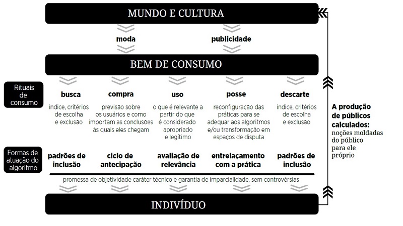 Entre as seis formas elencadas por Gillespie (2018), entende-se que a “promessa de objetividade” é a base do processo e é atuante em todos os momentos, pois a sensação de imparcialidade nunca deve se desprender das demais. Já a “produção de públicos calculados” é enxergada como resultante da atuação dos algoritmos nos rituais de consumo e retornam do indivíduo para o mundo e para a cultura; isto é, as noções moldadas sobre o indivíduo e o público reabastecem o primeiro nível de armazenamento dos significados, o mundo/cultura, de onde a moda e a publicidade absorverão tais significados, depositarão nos bens de consumo e darão origem a novos processos rituais (Figura 2).
