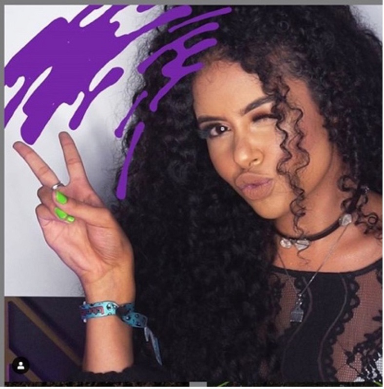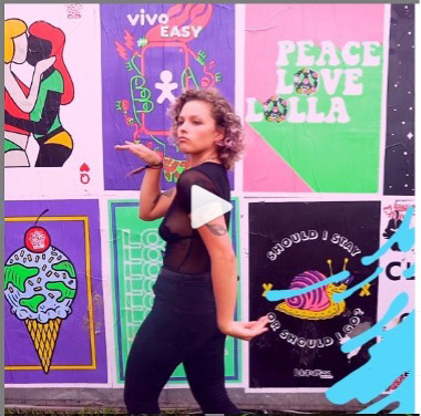 A legenda da primeira postagem traz o texto “Qual é o seu jeito de viver o #LollaBR? #EasyLollaBR”. A segunda postagem é acompanhada do texto “Venha viver o #LollaBR no modo #EasyLollaBR”. Já a legenda da terceira postagem apresenta o texto “Festival não é festival se não for do seu jeito. #EasyLollaBR”. A quarta postagem ( Figura 9) traz uma foto de uma mulher negra, a youtuber Steffany Borges, que faz um sinal de paz com os dedos das mãos. Acima da foto, assim como nas três primeiras, há uma intervenção digital com um traço roxo, por cima da imagem da mulher. O texto da postagem diz: “A @steffany_borges foi easy dos pés à cabeça no #LollapaloozaBR”.