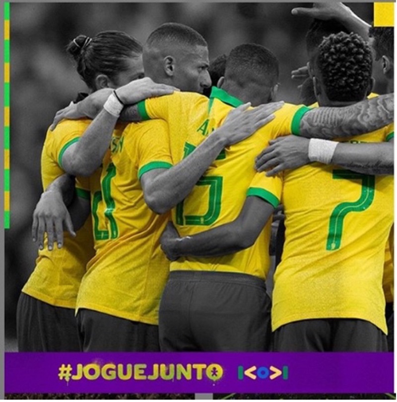 A primeira postagem traz uma foto em preto e branco, na qual o único elemento colorido é o uniforme da seleção brasileira de futebol masculina. Os jogadores aparecem abraçados de costas formando um semicírculo. Na região inferior da imagem, há uma tarja roxa, com o texto #JOGUEJUNTO. A legenda da postagem traz o texto “Vivo. #JogueJunto. A postagem foi realizada em função de partida disputada pela seleção brasileira na Copa América.