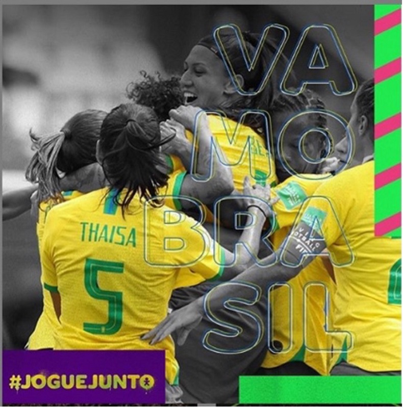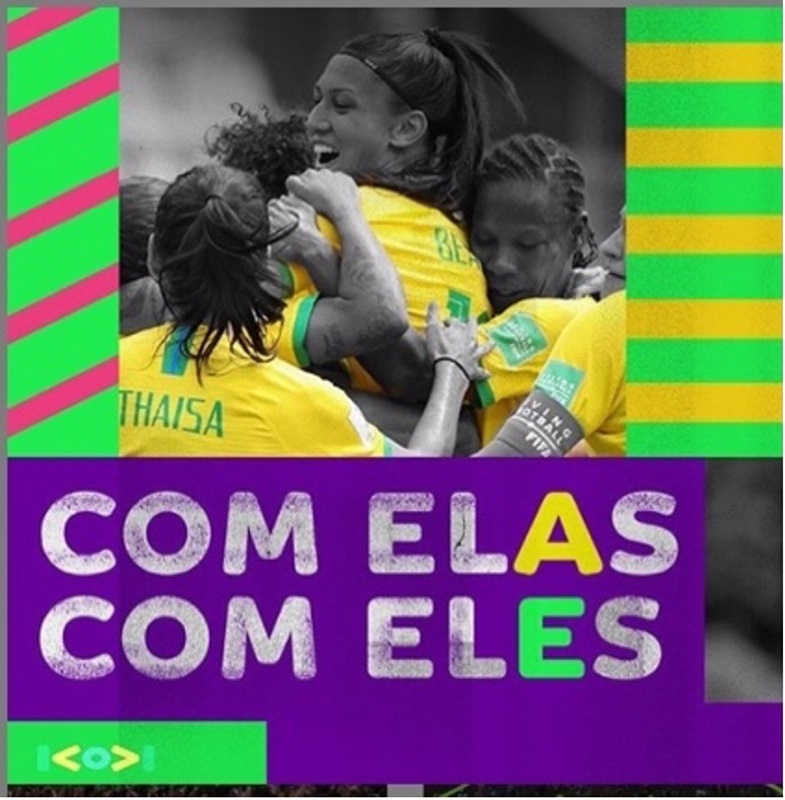 Na segunda postagem, com o mesmo tratamento visual da foto anterior, aparecem jogadoras da seleção feminina de futebol abraçadas, como se comemorassem um gol. A fotografia dessa postagem tem mais intervenções visuais que a anterior, com duas tarjas laterais, uma em verde e rosa e outra em verde e amarelo. Na área inferior, uma tarja roxa mais grossa, traz os dizeres “Com elas Com eles”, em duas linhas. A legenda da postagem traz o texto “Com elas e com eles é todo mundo jogando junto”. A peça faz referência à Copa América, torneio disputado pela seleção masculina na ocasião, mas também à Copa do Mundo de Futebol Feminino, disputada pela seleção feminina à época.