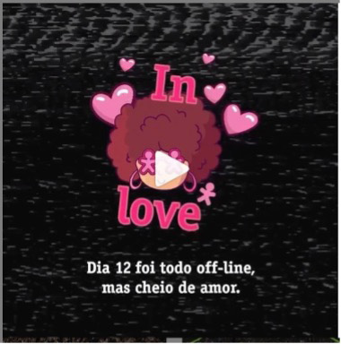 As duas postagens do dia 19 de junho fazem referência à campanha da operadora para o Dia dos Namorados e são peças em vídeo. Na primeira delas, um grupo de celebridades convida as pessoas a participarem da campanha Dia dos Namorados offline da Vivo, dentre eles, Preta Gil, Ana Paula Xongani e Steffany Borges, mulheres negras ( Figura 16). O segundo vídeo é apenas uma animação com a mascote da campanha, que também é uma pessoa negra ilustrada ( Figura 17).