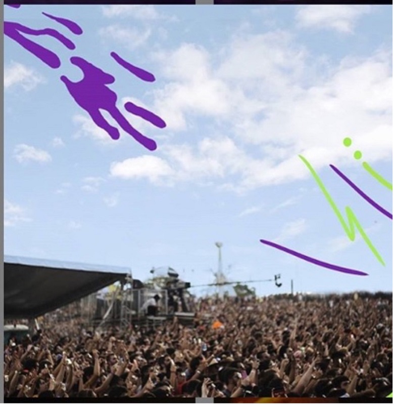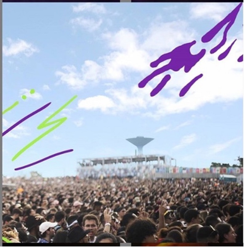 Avançando à observação das postagens do Instagram, percebemos que a maior parte (sete postagens) trazia fotos do festival Lollapalooza 2019, em ação de ativação da marca sobre o plano Vivo Easy. Nesse conjunto, as três primeiras ( Figura 6, Figura 7, Figura 8) apresentam fotos distantes da plateia do evento, em que, no meio da multidão, conseguimos perceber pessoas negras. Nas três fotos, há intervenções digitais em verde e roxo, representando respingos de tinta, em diálogo com a identidade do plano Vivo Easy.