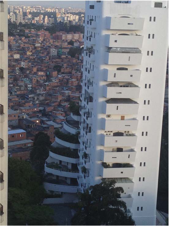 O bairro do Morumbi, lugar onde se concentram mansões e condomínios sofisticados, possui uma área de 11,5 quilômetros quadrados20. É um bairro arborizado, onde há muitos parques, o estádio de futebol do clube São Paulo, o Palácio do Governo, o prestigiado hotel de luxo Tangará, escolas caras e internacionais, um dos melhores hospitais da América Latina, o Albert Einstein, sendo considerada uma área de padrão social elevado. A comunidade de Paraisópolis se desenvolveu exatamente nessa região (SARMENTO, 2003), de modo que moradias precárias, com muito pouca ou quase nenhuma infraestrutura pública são rodeadas por prédios de alto padrão, inclusive o edifício de forma espiral, que ostenta uma piscina por andar21. “Símbolo da desigualdade social no Brasil, o Edifício Penthouse [exibido na Figura 3] é vizinho de muro de Paraisópolis [...]”22.