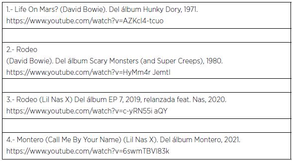 En este trabajo, realizamos un análisis simbólico de los videoclips de dos artistas David Bowie y Lil Nas X. David Bowie fue un músico, actor, productor y artista visual británico que tuvo una carrera influyente y prolífica durante más de cinco décadas. Bowie fue un innovador en la música pop y una figura destacada en la cultura popular. Comenzó su carrera musical en la década de 1960, pero fue en la década de 1970 cuando se convirtió en una superestrella con sus álbumes “The Rise and Fall of Ziggy Stardust and the Spiders from Mars” (1972) y “Aladdin Sane” (1973). En estos álbumes, Bowie desarrolló el personaje de Ziggy Stardust, una estrella del rock andrógina y alienígena que se convirtió en una figura icónica de la cultura pop. Bowie era un hombre blanco, europeo y bisexual. Representa los inicios en la simbología queer en la promoción audiovisual.