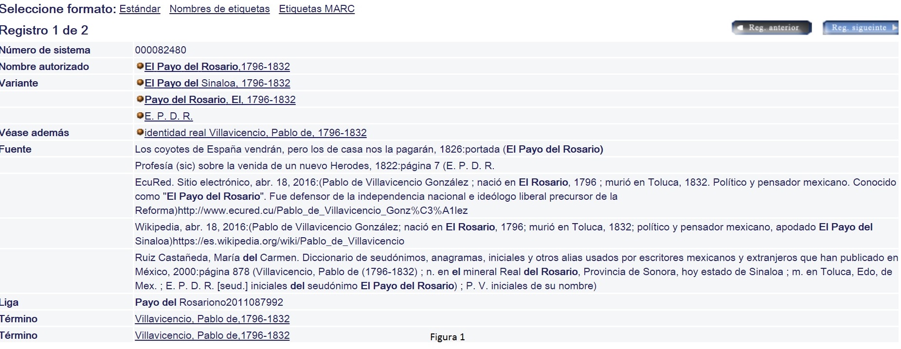 Por otro lado, el registro de autoridad determina cuál va a ser el punto preferido de acceso de acuerdo al recurso que lo valida, aunque muchas veces es necesario actualizar los registros bibliográficos retrospectivos para que la base bibliográfica sea consistente en su funcionamiento. Por lo regular, esto se presenta con puntos de acceso actuales que no concuerdan con los retrospectivos –siendo esto común en una Biblioteca Nacional–, pero que son puntos de acceso que vale la pena trabajar porque pueden ser variantes que en la época en que se catalogaron no fueron consideradas. Cabe mencionar que cada tipo de registro de autoridad, como los de nombres personales, figura 1-2 ; nombres de entidades corporativas, figura 3-4 ; nombres geográficos, figura 5 ; títulos de series, figura 6 , incluyen elementos o datos que lo componen que pueden ser sencillos o complejos según sea el caso.