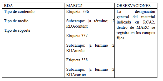 Se adecuó la plantilla MARC21 para monografías y se agregaron las etiquetas 336, 337 y 338 con sus correspondientes subcampos, de la siguiente manera: