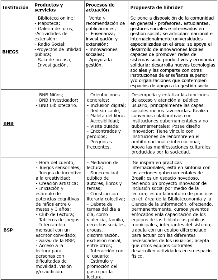 En la tabla 1 se representan los datos analizados en las bibliotecas híbridas brasileñas estudiadas, de acuerdo con los productos y servicios ofrecidos, los procesos de actuación de cada unidad con su comunidad y la propuesta de hibridez de cada institución.