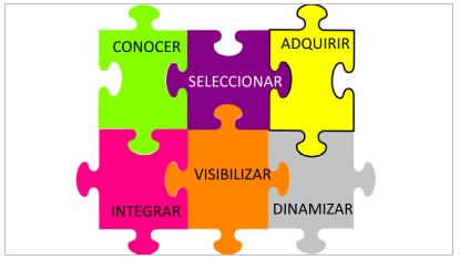 Una vez localizadas las diferentes estrategias, se procedió a su clasificación en torno a una secuencia lógica de acciones que se consideran esenciales para planificar un programa de actividades de integración de lo físico y lo digital, de lo presencial y lo virtual: conocer, seleccionar, adquirir, integrar, visibilizar y dinamizar.