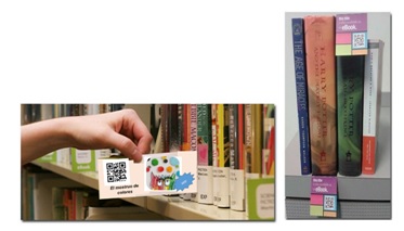 Cuando disponemos de ambos formatos, se puede incluir una pegatina en el ejemplar impreso o una tarjeta en el estante o en el propio libro, indicando su disponibilidad, ebook, app, etc., siempre incluyendo el código QR
