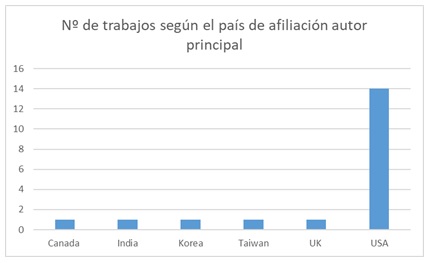 Uno de los primeros datos observados es que se trata de un tópico geográficamente muy concentrado: el 74% de los trabajos revisados tienen a su autor principal afiliado en USA, porcentaje que aumenta hasta el 95% si se tiene en cuenta la afiliación de todos los autores y no sólo la del autor principal.
