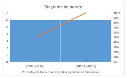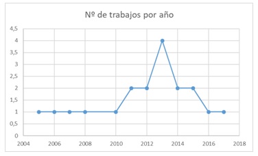 Teniendo en cuenta que con la metodología de revisión utilizada se extraen los artículos más relevantes, destacados o con mayor impacto sobre el tema, su evolución puede tomarse como referencial de la evolución del tema a nivel general. A este respecto, a pesar de que el gráfico de dispersión de la distribución de los trabajos por año (figura 3) muestra un pico en 2013 y luego parece decaer, vemos que, realizando un diagrama de pareto (figura 4), el porcentaje del número de trabajos sobre el total (mostrado en la línea acumulativa) es claramente ascendente en la segunda mitad de los años analizados. Esto indica que el tema ha tenido una evolución continuada y considerable en los últimos años, y que el descenso del número de trabajos recopilados en los años 2016 y 2017, que se observa en el gráfico de dispersión, se debe más bien a la falta de tiempo hasta la fecha para que esos trabajos hayan tenido la repercusión necesaria como para que una revisión sistemática de literatura los incluyese entre los resultados.