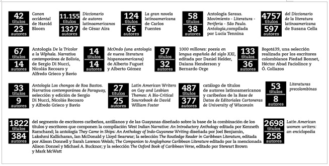 Latin American Women Writers aporta 2.951 obras de 303 escritoras nacidas entre los siglos XVI y fines del siglo XX. Los chongos de Roa Bastos y Saraus contribuyen con obras de autores nacidos en el periodo de 1965 y 1984 en el primer caso, De la Tricolor a la Wiphala propone autores nacidos entre 1956 y mediados de los 80; en el caso de Saraus, aporta autores nacidos entre 1957 y mediados de los 80, que en su mayoría inician sus trabajos literarios en las décadas del 90 y principios de los 2000; así como McOndo (una antología de nueva literatura hispanoamericana) aporta escritores nacidos entre 1959 y que se destacan en su trabajo literarios a mediados de los 90. La antología 1.000 millones: poesía en lengua española del siglo XXI (Helder, Henderson, y Orge, 2014) incluye 33 autores hispanoamericanos nacidos entre 1980 y 1995, y el Manifiesto del Crack (Palou, Urroz, Padilla, Chávez-Castañeda, y Volpi, 2000) incorpora seis autores mexicanos nacidos entre 1961 y 1968 y cuyas obras son todas posteriores a 1996. Asimismo, la selección de Bogotá39 (s.f.) -selección realizada por los escritores colombianos Piedad Bonnet, Héctor Abad Faciolince y Óscar Collazos- aporta 133 obras de 39 autores menores de 39 años en el año 2007.