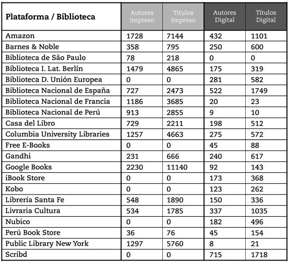 Con el objetivo de relevar la transposición de las obras del CLLyC a formato digital, se realizó la búsqueda de los mencionados títulos en dicho formato en 14 de las plataformas comerciales y en una serie de ocho bibliotecas destacadas desde el punto de vista lingüístico y que sobresalen por prestaciones, arquitectura y disponibilidad digital (Chowdhury y Foo, 2012; Klibanski, 2006; Tramullas Saz, 2002; Turiel, 2010). Amazon es, de hecho, la empresa número uno del mercado de libros electrónicos con más de 500.000.000 unidades vendidas (el 82% tomando en cuenta las ventas en EE. UU., Reino Unido, Canadá y Australia) (Author Earnings, 2017). Kindle Unlimited posee un catálogo de 4.600.000 de títulos (Ramírez, 2016). Su competidora Barnes & Noble tiene casi 3.000.000 de títulos de libros digitales. iBookstore y iTunes poseen una media de ventas mensuales de 17.000.000 de unidades (Dedieu, 2013). Google Books ofrece sus servicios de casi 350.000 títulos y su servicio Play Books ofrece más de 4.000.000 de títulos. Kobo es una plataforma canadiense de libros electrónicos de estándares abiertos, que alcanza a 10.000.000 de usuarios y posee un catálogo de más de 5.000.000 de libros (Ramírez, 2016). La selección de Free-eBooks se debe a la necesidad de obtener el estado de la oferta en digital de plataformas de descarga gratuitas. Scribd se presenta como un sistema de intercambio de archivos y acceso a libros electrónicos, con un catálogo de 700.000 libros. Nubico cuenta con 100.000 clientes y dispone de más de 20.000 títulos. Livraria Cultura, Gandhi y Librería Santa Fe son plataformas destacadas en el comercio editorial latinoamericano. En el nivel de las bibliotecas, Public Library New York y Columbia University Libraries son bibliotecas prestigiosas a nivel internacional por la disposición de múltiples recursos en digital. La Biblioteca Nacional de España es la biblioteca más reconocida en el campo idiomático del castellano, así como Gallica - Biblioteca Nacional de Francia es la más reconocida en lengua francesa. Europeana es una biblioteca digital que posee casi 4.000.000 de objetos digitales de la Unión Europea. La Biblioteca del Instituto Latinoamericano de Berlín se seleccionó como biblioteca de un organismo especializado en temas latinoamericanos. Las bibliotecas Nacional de Perú y de San Pablo forman parte del segmento de bibliotecas latinoamericanas con mayor disposición de colecciones en digital del área geográfica.