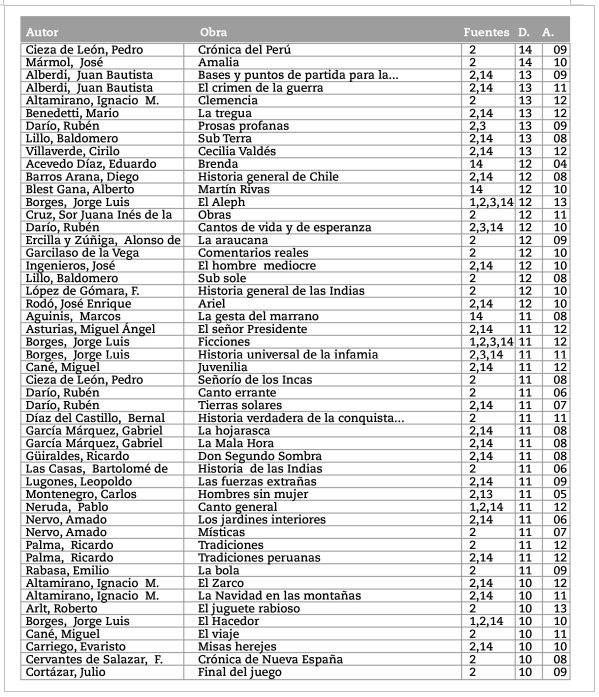 En lo que hace a los resultados obtenidos en las búsquedas efectuadas por títulos literarios componentes del CLLyC (y los autores de estos), destacamos los resultados de los títulos que aparecen en más de 10 plataformas y bibliotecas (Figura 3. La columna“Fuentes” refiere a la cantidad de segmentos del CLLyC en que ubicamos el título; la columna “D” refiere a la cantidad de veces que fue hallado en digital; la columna“A” refiere a la cantidad de veces que fue hallado en soporte impreso). De los primeros 50 títulos que aparecen en soporte digital en las búsquedas realizadas, el 82% de ellos (41 títulos) pertenecen a autores cuyas obras están en dominio público. Esto ratifica que se transponen con mayor frecuencia aquellos títulos por los cuales no se pagan derechos. Así, solo dos títulos están presentes en 14 plataformas y bibliotecas: Crónica del Perú, de Pedro Cieza de León y Amalia, de José Mármol (obras que pertenecen al dominio público, en términos de derechos de autor). Luego, ocho títulos están presentes en 13 plataformas y bibliotecas. De ellos, seis títulos pertenecen al dominio público y solo uno es un título del canon de Bloom: El Aleph, de Jorge Luis Borges. El restante es la novela La tregua, del escritor uruguayo Mario Benedetti, cercana al bestseller dado que en América Latina se la relaciona con la película de Sergio Renán, que adoptó la novela como guion y se constituyó en el primer filme de la región en competir por un premio Oscar. El resto de los 50 títulos está presente en 10, 11 y 12 plataformas y bibliotecas. A su vez, de los primeros 50 títulos que más aparecen en digital cuatro son títulos bloomianos: tres son los volúmenes de cuentos de Jorge Luis Borges: El Aleph; Ficciones y El hacedor; además de Canto General de Pablo Neruda. Y, de esos 50 títulos, 20 son títulos de autores canónicos. A los ya mencionados se agregan títulos de los mismos Borges y Neruda y de los escritores bloomianos Gabriel García Márquez, Julio Cortázar, Miguel Ángel Asturias y Rubén Darío. De estos títulos, están en dominio público las seis obras pertenecientes a Rubén Darío. Asimismo, doce títulos con 10, 11 y 12 presencias en plataformas y bibliotecas son obras en dominio público de José Mármol, Rubén Darío, José Rodó, Cirilo Villaverde, López de Gómara, Alonso Ercilla, José Ingenieros, Inca Garcilaso, Francisco Cervantes de Salazar, Baldomero Lillo.