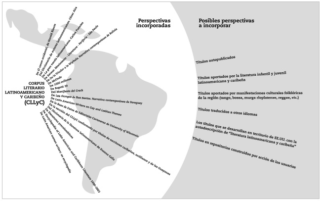 Asimismo, el corpus diseñado para las búsquedas se asienta en la aceptación de la porosidad e inestabilidad del sistema y en la inclusión de formas antagónicas y complementarias. De esta manera autoriza a ser replicado con fines investigativos diversos, dado que su configuración permite la supresión de algunas de las formas que lo componen y la inclusión de otras. Ahora bien, en el marco de la infinitud del corpus dada la vastedad de narrativas, poéticas y dispositividades de la literatura latinoamericana y caribeña, se detectan algunas perspectivas a incorporar como segmentos de este: los títulos autopublicados por sus autores; los títulos aportados por la literatura infantil y juvenil latinoamericana y caribeña; los títulos aportados por las literaturas religiosas de la región; los títulos aportados por manifestaciones culturales folklóricas de la región (tango, bossa, murga, reggae); los títulos y autores aportados por perspectivas tales como los estudios judeolatinoamericanos y los estudios afrolatinoamericanos; los títulos traducidos a otros idiomas; los títulos que se desarrollan en territorio de EE. UU. con la autodescripción de “literatura latinoamericana y caribeña”; los títulos en repositorios construidos por acción de los usuarios; las literaturas escritas en las lenguas de los pueblos originarios de la región; etc. Eagleton (1998, p. 22) afirma que “se deduce de la definición de literatura como forma de escribir altamente apreciada que no es una entidad estable”. Esa inestabilidad se ha tomado en consideración para la construcción del CLLyC con la incorporación de formas sistémicas y extrasistémicas. Así, la inclusión de otras perspectivas (Figura 5) corroboraría la eficacia del diseño del CLLyC en el marco de la alteración de los segmentos que lo constituirían.