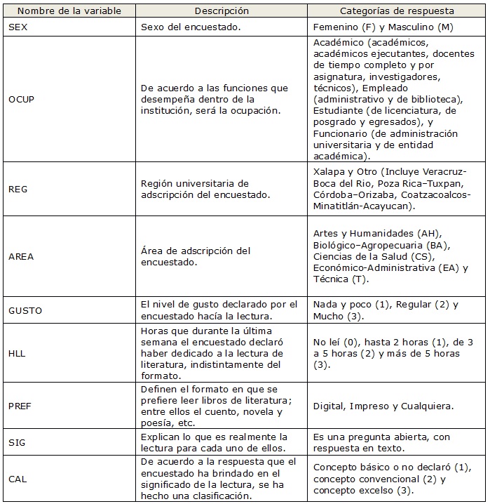 En la Tabla 1 se presentan las variables que se consideraron para este estudio. Después de un proceso de limpieza, eliminando casos incompletos, la base de datos que se sometió a análisis estadísticos contó con 1311 registros. Asimismo, se pueden ver los nombres y las categorías de los indicadores utilizados en los análisis: GUSTO, HLL, PREF y CAL. Para la realización de los análisis se obtuvieron las distribuciones de frecuencias de las variables una a una y se estudió la significancia de las asociaciones de parejas de variables, considerando a la preferencia del tipo de soporte para leer literatura como variable respuesta, lo que se realizó a partir de la prueba Ji-Cuadrada. Una vez identificadas las asociaciones significativas se realizó un análisis de correspondencia múltiple (Nenadic´ y Greenacre, 2007) para explorar las asociaciones multivariantes.