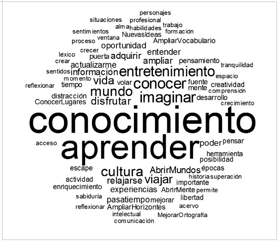 Al analizar los conceptos de lectura vertidos por aquellos que declararon que prefieren el formato impreso, como puede verse en la Figura 9, se resalta “aprender” y “conocimiento”, que son palabras más asociadas a la lectura utilitaria. Sin embargo, “entretenimiento”, “imaginar”, “viajar”, “cultura”, “abrir mundos”, etc., también aparecen, aunque claramente en segundo término. Esto genera una serie de hipótesis que implican realizar una minería de datos más profunda.
