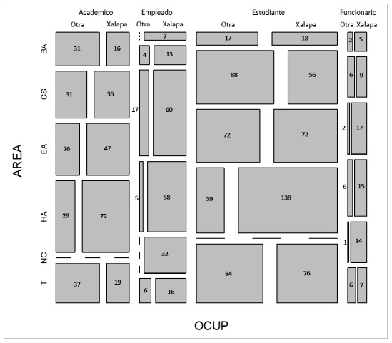 Cuando la preferencia se cruzó con área académica (Ji-Cuadrada=11.409, gl=10, p= 0.327) y ocupación (Ji-Cuadrada=8.7751, gl= 6, p= 0.187) no se observaron asociaciones significativas; el cruce con región (Ji-Cuadarada=5.0112, gl= 2, p=0.082), resultó con una significancia leve, con una proporción de 73% que prefiere el texto impreso en la región de Xalapa, lo cual no resulta realmente significativo.