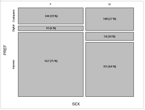El principal resultado de este estudio es que 7 de cada 10 de los encuestados prefirió el texto impreso para la lectura no utilitaria; entre los de sexo masculino la proporción decrece hasta 6 de cada 10, lo que constituye evidencia estadística altamente significativa de la asociación del sexo con la preferencia (ver Figura 3).