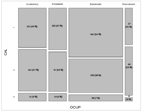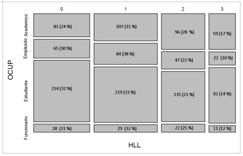 En lo que se refiere a los conceptos de lectura, los más básicos o de ausencia de opinión se presentaron entre los estudiantes y los empleados, mientras que los más elaborados aparecieron en el grupo de los académicos y los funcionarios; esta relación resultó estadísticamente significativa como puede verse en la Figura 6.