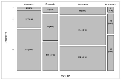 Respecto al gusto por la lectura se obtuvo que los académicos y los funcionarios declararon, en una proporción de 7 y de 6 de cada 10, respectivamente, que les gusta mucho la lectura de literatura, contra 5 y 4 de cada 10 entre los empleados y los estudiantes, respectivamente. Esta asociación es estadísticamente significativa, como se puede constatar en la Figura 5.