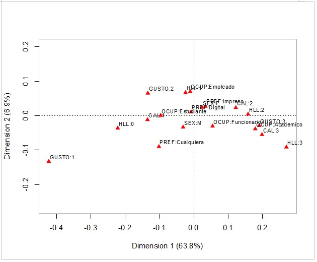 Al realizar el análisis multivariante se encontraron algunas asociaciones a destacar: los que dijeron dedicar menos tiempo a la lectura tienden a preferir cualquier formato y tienden a declarar que les gusta poco o nada la lectura de literatura, mientras que los que dijeron que le dedicaron más tiempo a la lectura de literatura son mayoritariamente los que dijeron que les gusta mucho leer, con mayor frecuencia de académicos y funcionarios. Esto puede verse en la Figura 8, que tiene una representación de un poco más del 70% de la variabilidad de los datos.
