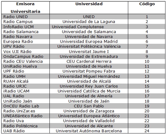 Nuestra muestra está compuesta por un total de 24 radios universitarias, todas ellas pertenecientes a ARU. Fuera de la muestra quedan otras 5 universidades que tienen los proyectos radiofónicos en pausa o redefinición. Las emisoras que completan la muestra quedan recogidas en la Tabla 1, con la asignación de un código numérico que será utilizado en las tablas de resultados.
