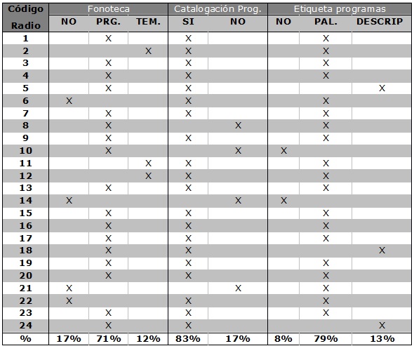 Finalmente, la Tabla 3 recoge otros parámetros analizados: la catalogación de los programas; el uso de tags o etiquetas en la descripción de los mismos y la creación de fonotecas accesibles para conservar el patrimonio sonoro.