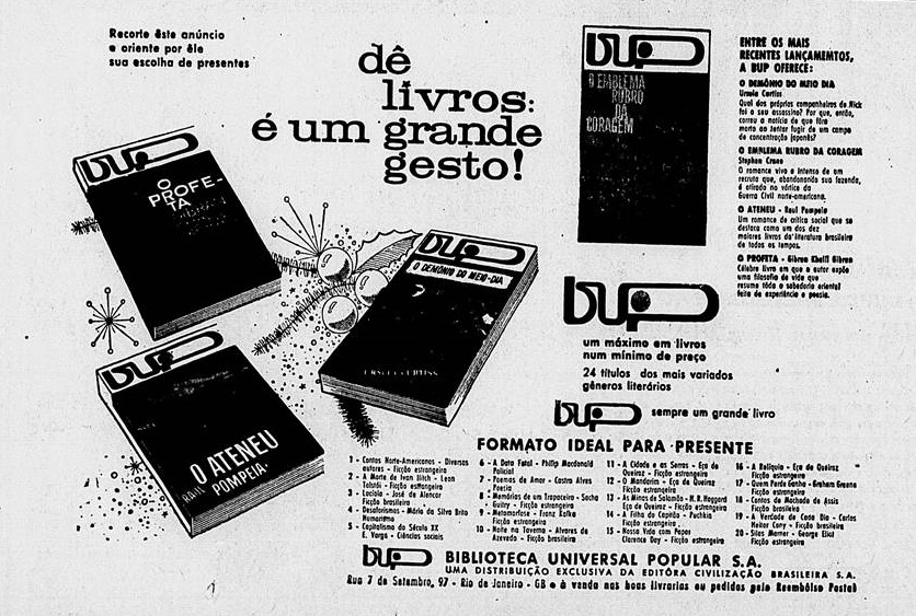 Uma coluna não assinada no Correio da Manhã de 18 de maio de 1963 anunciava que uma “nova editora” havia sido fundada no então estado da Guanabara. Tratava-se da Biblioteca Universal Popular (BUP), que se dedicaria a editar “livros de bolso com séries sobre ficção brasileira e estrangeira, policial e aventuras, dicionários e humorismo, teatro, clássicos, ciências sociais e utilidades, literatura infantil e de divulgação”, conforme se pode ler na referida coluna (acessível pela hemeroteca da Biblioteca Nacional). Entre os diretores da “nova editora” estavam Ênio Silveira (Diretor Presidente) e Mário da Silva Brito (Diretor Editorial), nomes ligados à Editora Civilização Brasileira, uma das mais importantes e ativas editoras brasileiras àquela altura.