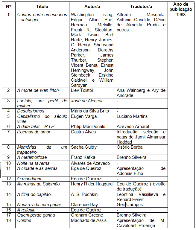 O conto norte-americano, antologia; A morte de Ivã Ilitch, novela de Tolstoi; Lucíola, de José de Alencar; Capitalismo do século vinte, de E. Varga; A data fatal, novela policial de Philip MacDonald; Poemas de amor, de Castro Alves (com introdução e notas de Jamil Almansur Haddad); Memórias de um trapaceiro, de Sacha Gitry; e Desaforismos, livro de humor de Mário da Silva Brito. Após estes primeiros volumes, a BUP editará, por mês, pelo menos dois títulos novos (Correio da Manhã, 24 jul. 1963).
