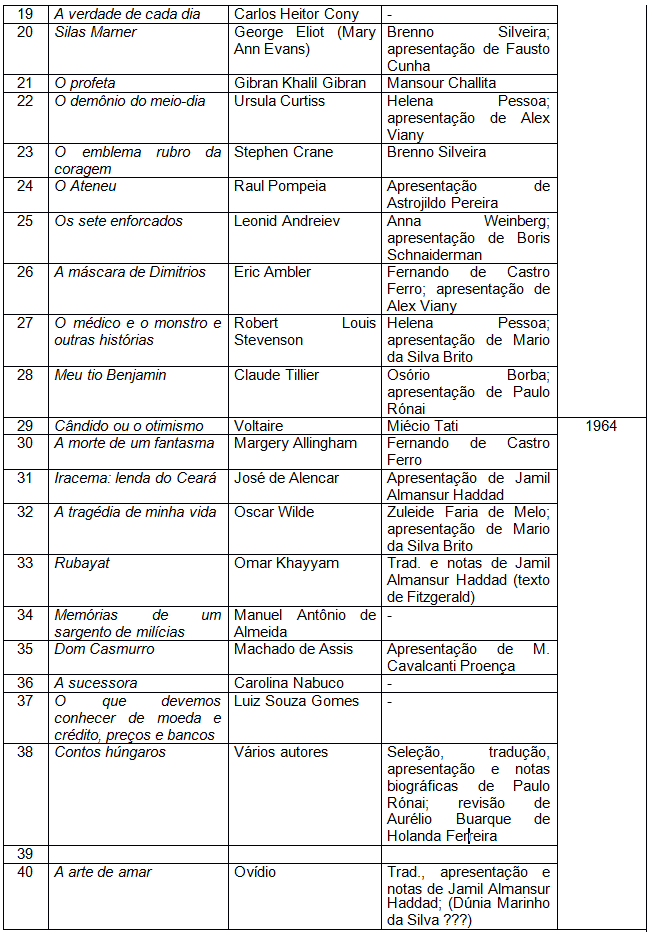 Novamente no Correio da Manhã, em 24 de julho de 1963, desta vez na coluna “Escritores e Livros”, assinada por José Condé, anunciam-se os oito primeiros volumes da BUP, a saber: