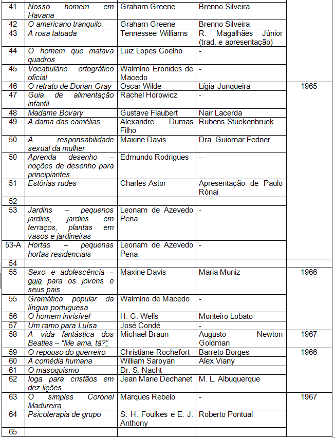 A fim de recuperar parcialmente a história material da BUP, passamos à recomposição de seu catálogo, com base na investigação que partiu de nosso acervo particular, mas principalmente do acervo da Biblioteca Nacional e do “sebo” Estante Virtual, ambos on-line. O acervo privado oferece uma pista da extensão de uma coleção que chega a dezenas de títulos, embora não tenha sido possível precisar todos. É comum encontrar, no percurso de pesquisa, problemas que, juntos, levam à extrema dificuldade de localizar determinada obra: sem registro nas orelhas de outros livros da coleção, inexistência nos acervos consultáveis, possível não publicação, ainda que um título tenha sido anunciado como lançamento, entre outros. A história dos livros, neste caso, de uma coleção em muito se parece com a história humana, em suas imprecisões e omissões. Vejamos a recomposição de um catálogo possível da BUP no quadro 1.