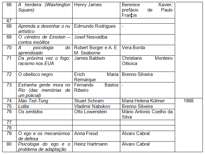 Abstract: In this work, we have focused in at least two elements of edition that are crucial to the understanding of the modes of production and the circulation of books in Brazil. These are the notions of “popular book” and “pocket book”, both closely related to each other and also to production and sales strategies, book formats, book design and certain literary genres or “bookstore” genres. For the purposes of conceptual discussion and analysis of editorial practices, we will deal here, with the Biblioteca Universal Popular (Universal Popular Library). This is a collection of paperbacks published in Brazil between 1963 and 1968 by Editora Civilização Brasileira, one of the most important publishing houses in activity at that time. Another relevant aspect of the present study is the recomposition of the catalog of this collection, which represents one of the many attempts of Brazilian publishers to approach the pocket book market through the edition of low cost books with a wide circulation. The collection and organization of the information presented here are based on investigations in private libraries and in various websites, especially in the online collection of Fundação Biblioteca Nacional and in the website of Estante Virtual.