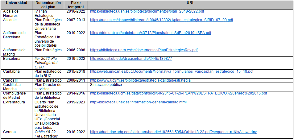 Recopilar planes estratégicos de bibliotecas universitarias españolas (OE 1).