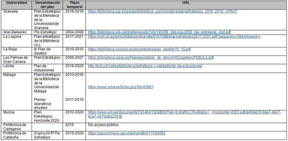 Seguidamente, se localizaron los planes estratégicos de las bibliotecas universitarias seleccionadas, para ello se hizo una búsqueda en los sitios webs de las bibliotecas y una consulta por correo electrónico a los bibliotecarios responsables. Todo ello durante los meses de noviembre y diciembre de 2019.