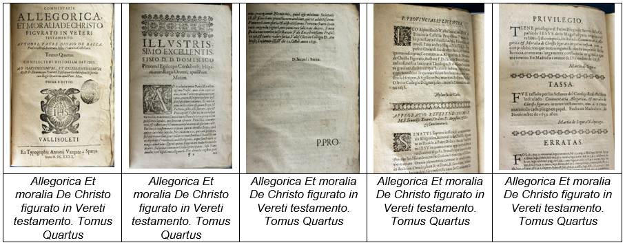 Las portadas, en su mayoría impresas en una o dos tintas con presencia de múltiples elementos ornamentales tipográficos, están compuestas por el título de la obra, las líneas que dividen los textos, los filetes decorativos, los tacos tipográficos, las hojas, las estrellas, las autorizaciones, los grabados y los impresores. Sobre estos últimos, se pueden mencionar a: Antonio Pérez de Soto, Antonio Vazquez y Esparza, Nicolai Angeli Tinafsij, ex officina Christophori Plantini architipographyregij, Blas Román, Gabriel Ramírez, Apud Gafparem Bindonum, Juan de Zúñiga, Balthasaris Moreti, Pedro Marín, Ex officina typographica Jo. Mathiæ Hovii, Pedro Madrigal, Gabriel Ramos Bejarano, Jayme Osset, Benito Cano, Joseph y Tomas de Orga, Benito Monfort , Joseph Rodríguez y Escobar, Andrés García, Pablo de Val, Gregorio Hermosilla, Juan Piferrer, Pedro Escuder, Manoel Soares, Pauli Mauli, Ioannis Barrerij, Bernardo Acosta Carvalho, Manuel Martin, Luys Sánchez, Melchor Sánchez, Pedro Marín, Joaquín Ibarra, Antonio Muñoz Del Valle, Herederos de la viuda de Juan García Infanzón, Juan Flamenco, Juan-Maria Salvioni Tipografía del Vaticano, Typographia Balleoniana, Hieronymi Mainardi y Apud Ioannem Keerbergium (ver figura 7).