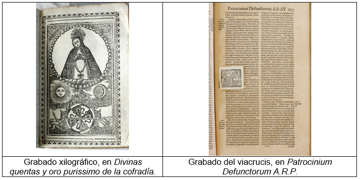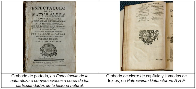 También se pudo constatar la existencia de las técnicas de grabado determinadas para el reconocimiento y la clasificación de los libros antiguos en el corpus de la investigación, como el grabado xilográfico en las portadas y de cierre, y llamados de texto (ver figura 10).
