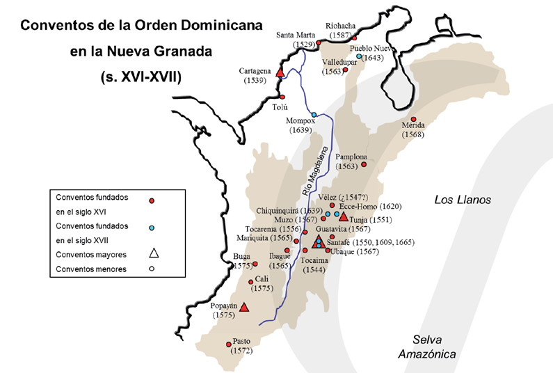 Pedro Durán y Juan de Montemayor eran dominicos, quienes llegaron a Tunja un año después de fundación de la ciudad, en 1539. De Durán se afirma que bautizó a Aquimín, último zaque del territorio conocido como Hunza, y a Sugamuxi, máximo sacerdote de los muiscas (Plata, 2016, p. 16). En esta ciudad, “de acuerdo con los censos de 1551, los dominicos ya administraban activamente 36 centros doctrineros” (Rivadeneira como se cita en Universidad Santo Tomas [USTA], 2011, p. 46), y entre los siglos XVI y XVII llegaron a fundar 25 conventos en la Nueva Granada (ver imagen 1).