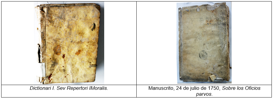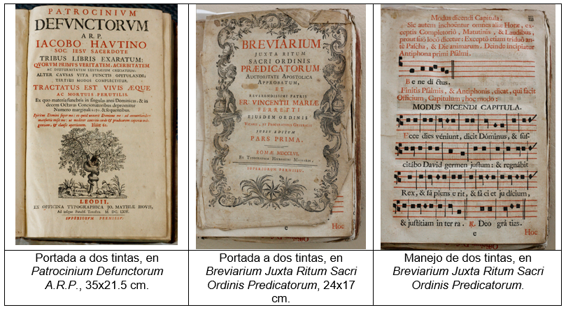 En cuanto al análisis de las portadas y las tintas empleadas, se pudo determinar que, aunque la mayoría de los libros están impresos a una sola tinta, hay libros en dos tintas: roja y negra. Las encuadernaciones son variadas, de forma predominante se destaca en pergamino, aunque también se hallan en madera forrada en piel o tela o con cierres laterales en cuero o en metal.