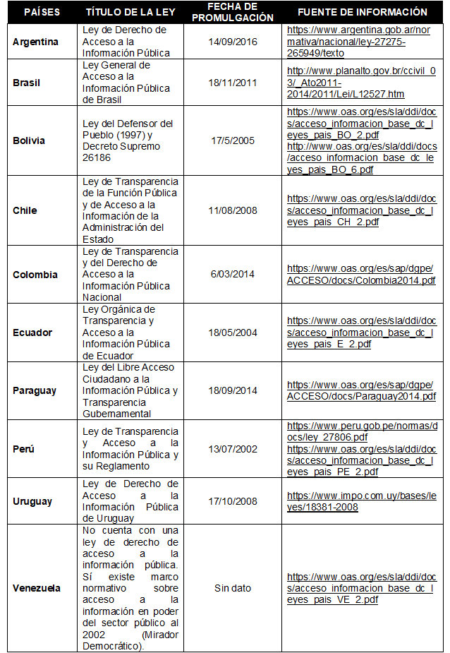 Como en buena parte de los países de la región, en Uruguay, la promulgación de la Ley de Derecho de Acceso a la Información Pública es relativamente reciente, tal como se observa en la Tabla 1.