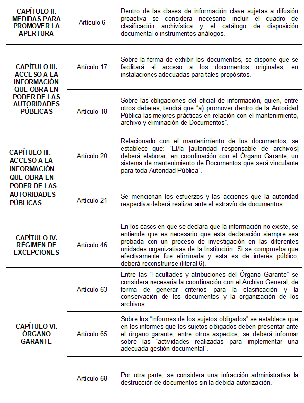 En ambos casos, la presencia y participación de los archivólogos en la redacción de las leyes ponen de manifiesto la importancia y lo necesario —imprescindible— del vínculo entre el acceso a la información pública y la gestión de documentos y la administración de archivos. Esta relación es evidente en las leyes cuando se menciona el deber del Estado de conservar y organizar el “Patrimonio Documental de la Nación y de los documentos de gestión como instrumentos de apoyo a la administración, a la cultura, al desarrollo científico, y como elementos de prueba, garantía e información” y la responsabilidad de crear y mantener los archivos profesionalmente organizados, como forma de garantizar la plenitud del ejercicio del acceso a la información.