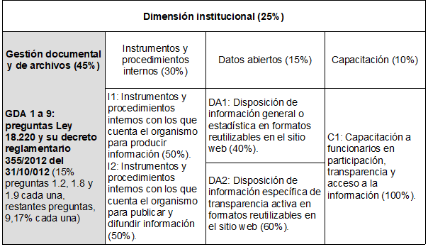 La distribución de la ponderación correspondiente a la dimensión institucional se subdividió de la siguiente forma, otorgando a la gestión documental y de archivo el 45% del total, como se ve en la Tabla 3.