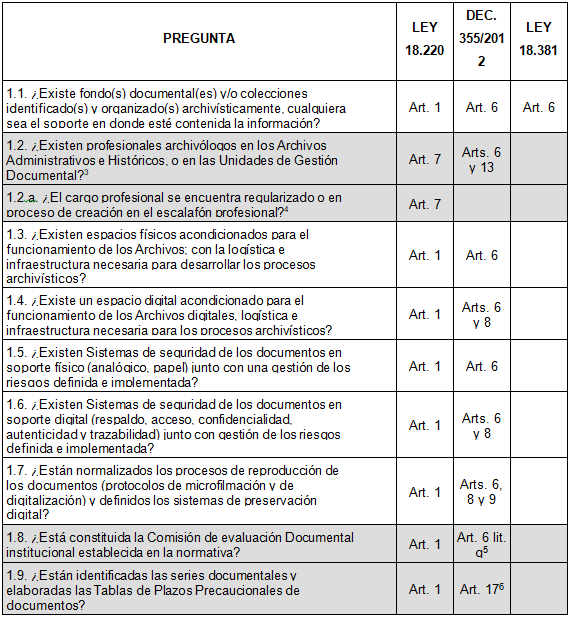 De las 11 preguntas formuladas sobre gestión documental y de archivos, las preguntas 1 a 9 estuvieron relacionadas con normativa de carácter preceptiva para los sujetos obligados de la Ley del Sistema Nacional de Archivos y de Derecho de Acceso a la Información Pública, tal como puede apreciarse en la Tabla 4. De ellas, las preguntas 1.2, 1.8 y 1.9 refieren a obligaciones y procesos expresamente mencionados en las normas, por eso su valoración es de un 15%, frente a las demás preguntas, que fueron ponderadas con un 9,17% cada una.