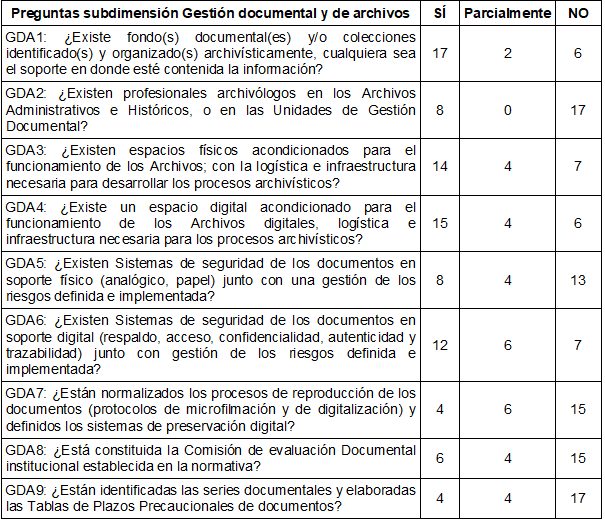 En particular, los resultados de la dimensión institucional – que se pueden ver en la tabla 5- son los que obtienen los menores puntajes en comparación con las demás dimensiones del índice, y son los resultados de gestión documental y de archivos los que tienen una puntuación general por debajo del promedio.