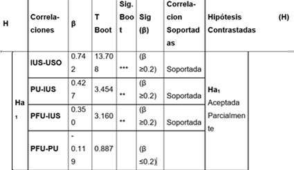 Resumen Fase 3: los resultados de las pruebas permitieron una aceptable valoración del modelo estructural lo que permitió proseguir a la evaluación de los valores coeficiente β y Bootstrap cuyas correlaciones soportadas permitieron contrastar las hipótesis de estudio (Tabla 3).
